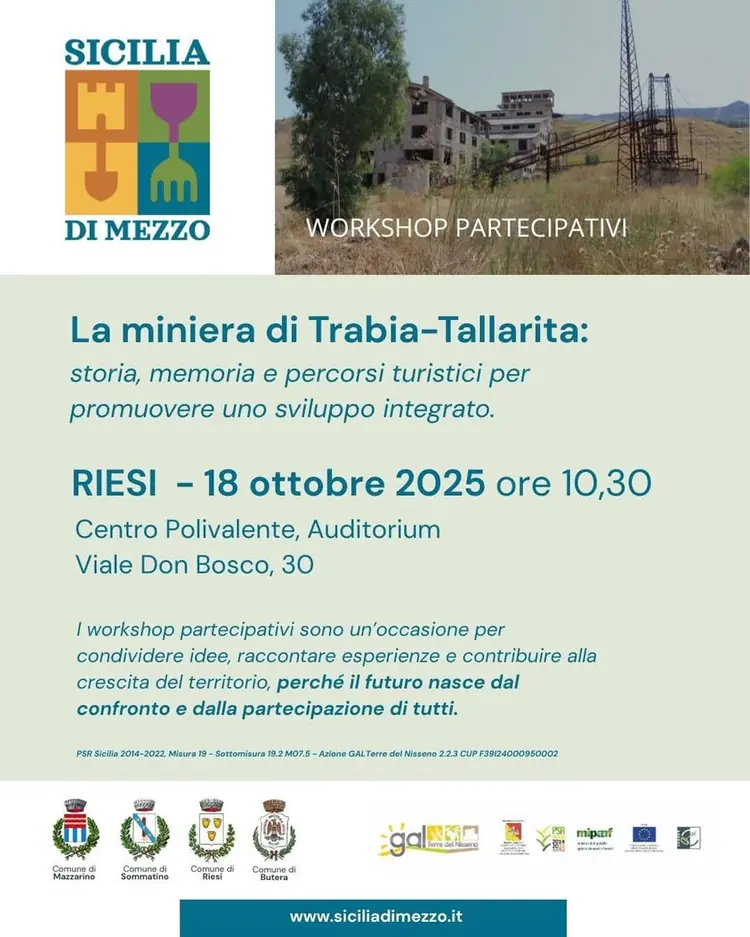 Un luogo dove storia, memoria e futuro si incontrano. Il workshop partecipativo dedicato alla miniera di Trabia–Tallarita sarà un momento di confronto e crescita condivisa per promuovere nuovi percorsi turistici e culturali, e valorizzare la memoria industriale del territorio. 📅 18 ottobre 2025 – or