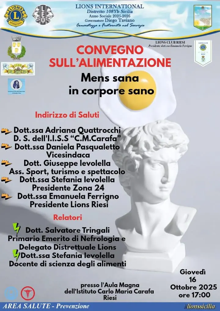 🌿 Giornata Mondiale dell’Alimentazione 2025 🍎 In occasione di questa importante ricorrenza, il Lions Club Riesi, in collaborazione con l’Istituto Carlo Maria Carafa e l’Amministrazione Comunale di Riesi, organizza il convegno dal titolo: 🧠💪 “Mens sana in corpore sano” Un momento di confronto e rifle