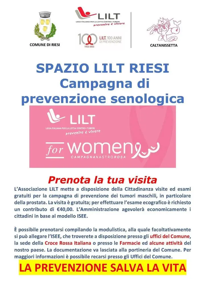 --- COMUNICAZIONE. OTTOBRE ROSA COMUNE DI RIESI. INIZIO ATTIVITA’ DI PREVENZIONE --- Il Comune di Riesi annuncia che anche quest’anno è confermata la misura destinata a iniziative di screening finalizzate alla prevenzione, in collaborazione con l’Associazione LILT Caltanissetta. Comunichiamo alla