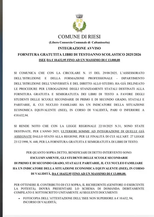 “LAVORI DI SISTEMAZIONE MIGLIORAMENTO E MANUTENZIONE SCUOLA MEDIA A. D'ANTONA RIESI (CL)” Procedura Aperta sotto soglia comunitaria ai sensi dell’art. 71 del D. Lgs n. 36/2023. Criterio: minor prezzo ai sensi dell’Art. 108 del D. Lgs. n. 36/2023, con la c.d. “inversione procedimentale” ai sensi del